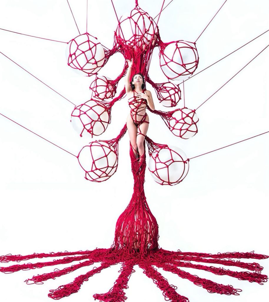 Kinoko’s creations are instantly recognizable by their use of red rope—a symbol of destiny’s thread and aesthetic tension—and by their seamless integration of natural elements, architecture, and the human form.